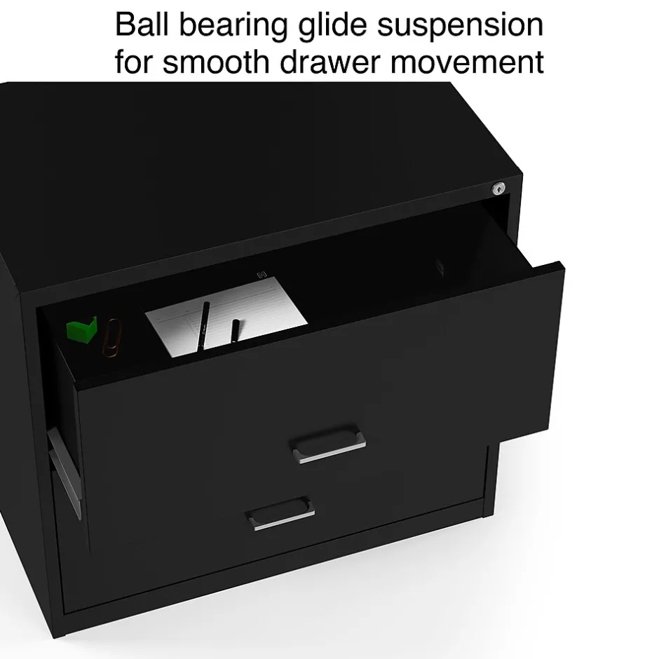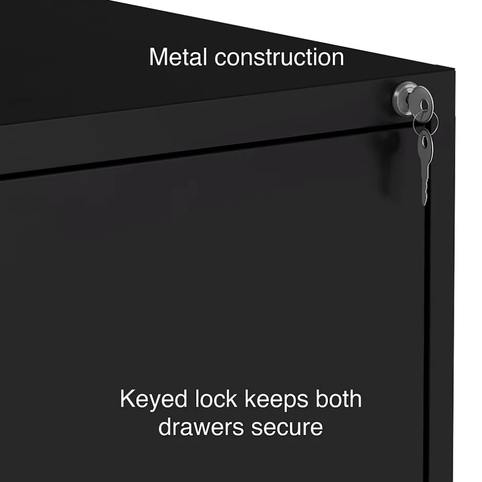 Expand your business filing system with this light duty lateral file cabinet. Two generously sized drawers offer ample space for organizing and storing paperwork, while the keyed lock keeps sensitive paperwork stored securely inside. The durable metal construction stands up to frequent use in your home office or smaller professional workspace. Each drawer accepts letter-size file folders, so you can store a wide range of documents in this black two-drawer file cabinet.