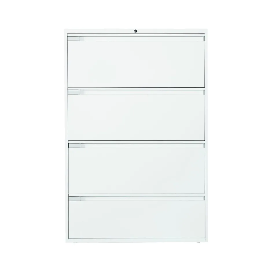 - Four-drawer lateral filing cabinet holds letter or legal-size documents