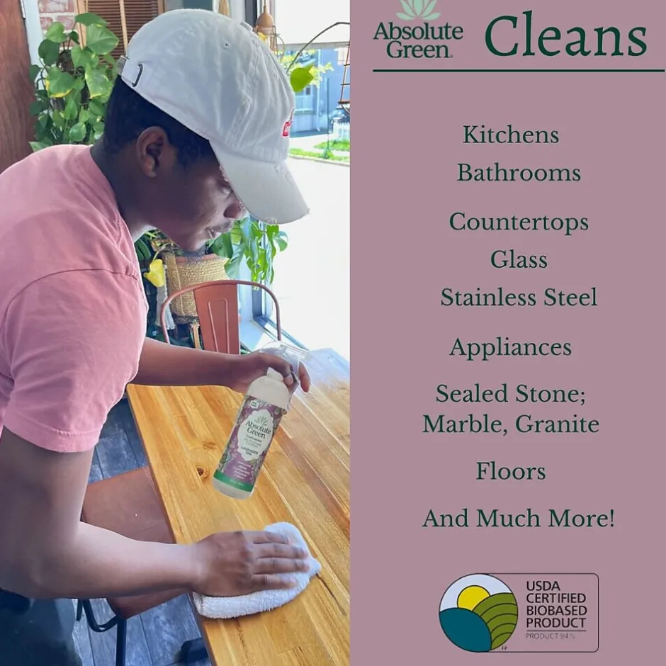 Its like a spa vacation without the travel. Eco-friendly Absolute Green Natural lavender spa cleaner is made from a blend of powerful, all-natural plant-based cleaning ingredients along with 100% pure essential oils. This multi-purpose effective herbal cleaner will leave your place sparking and add a little zen too!