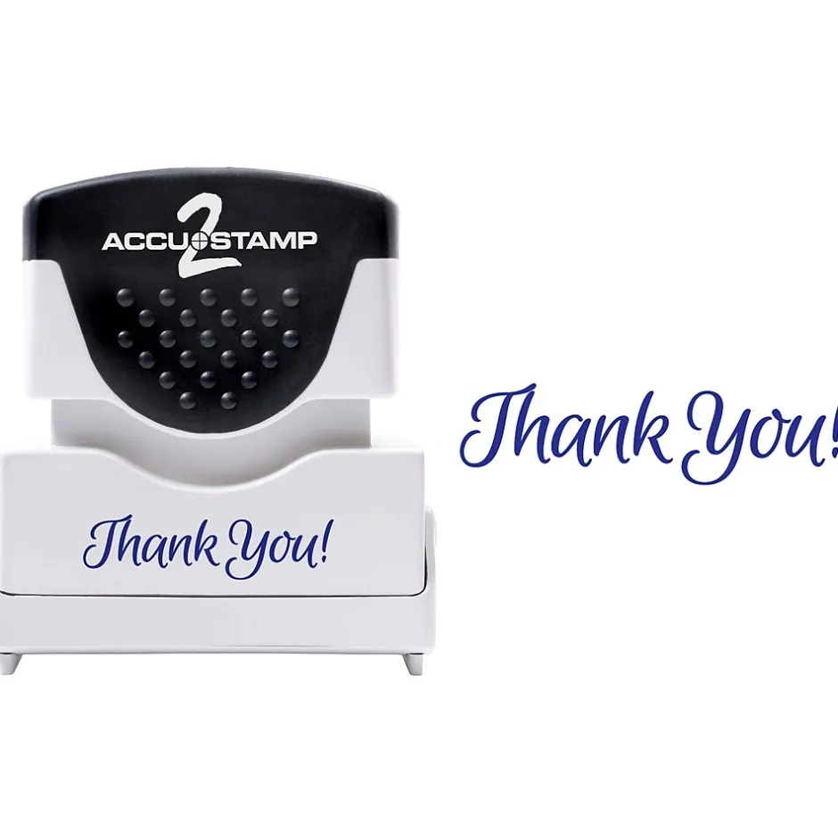 The Accu-Stamp pre-inked one-color message stamp features an ergonomic grip and shutter dust cover that automatically opens and closes while stamping.