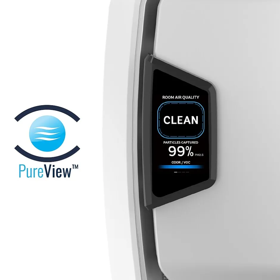 - See real time air quality data: PureView â„¢ Technology shows the percentage of particles captured and a live status of room air quality