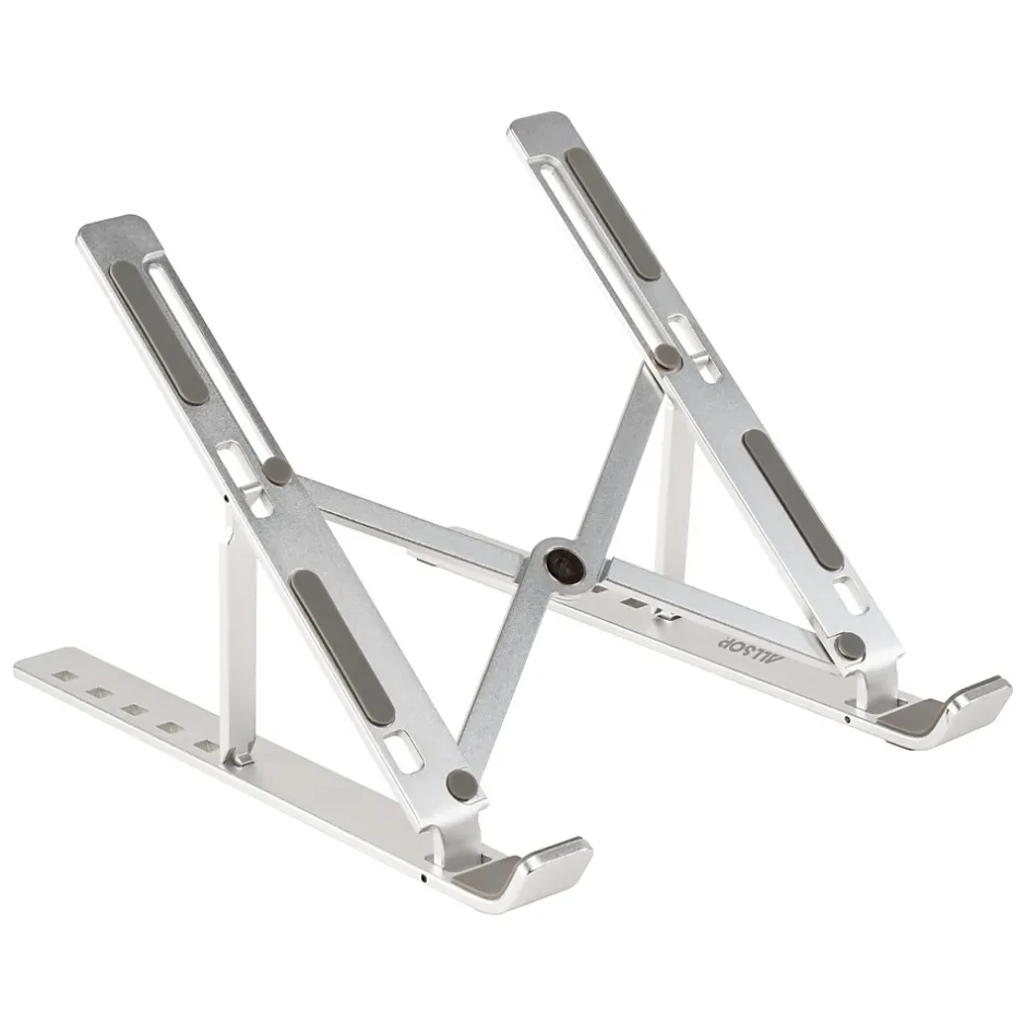 Raise your laptop to an ergonomic viewing height wherever you go with the Allsop Compact Aluminum Laptop Stand. Made from aircraft-grade aluminum, this compact laptop stand features six adjustment levels to place your laptop or tablet at the perfect height and angle. Silicone pads on the arms and feet keep the stand and your laptop securely in place. The stand is less than 2” wide when folded for transport and comes with a convenient carry bag.