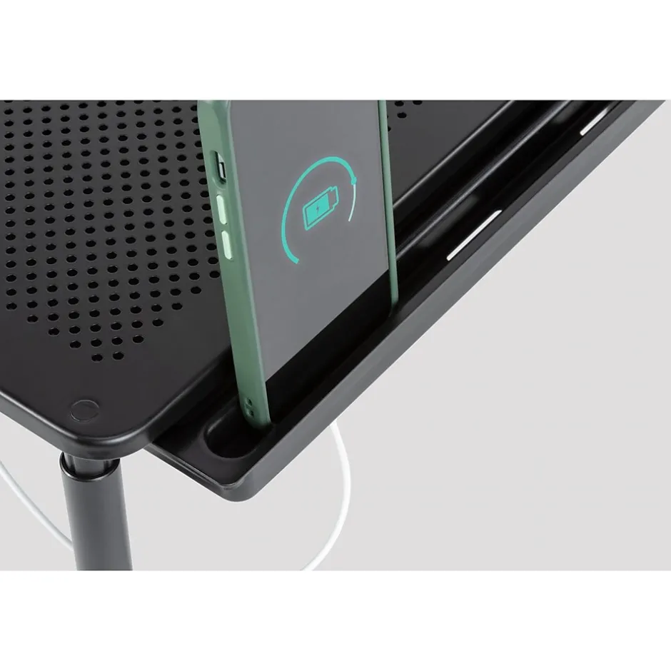 - Storage drawer has a built-in phone stand slot with holes for charging cords