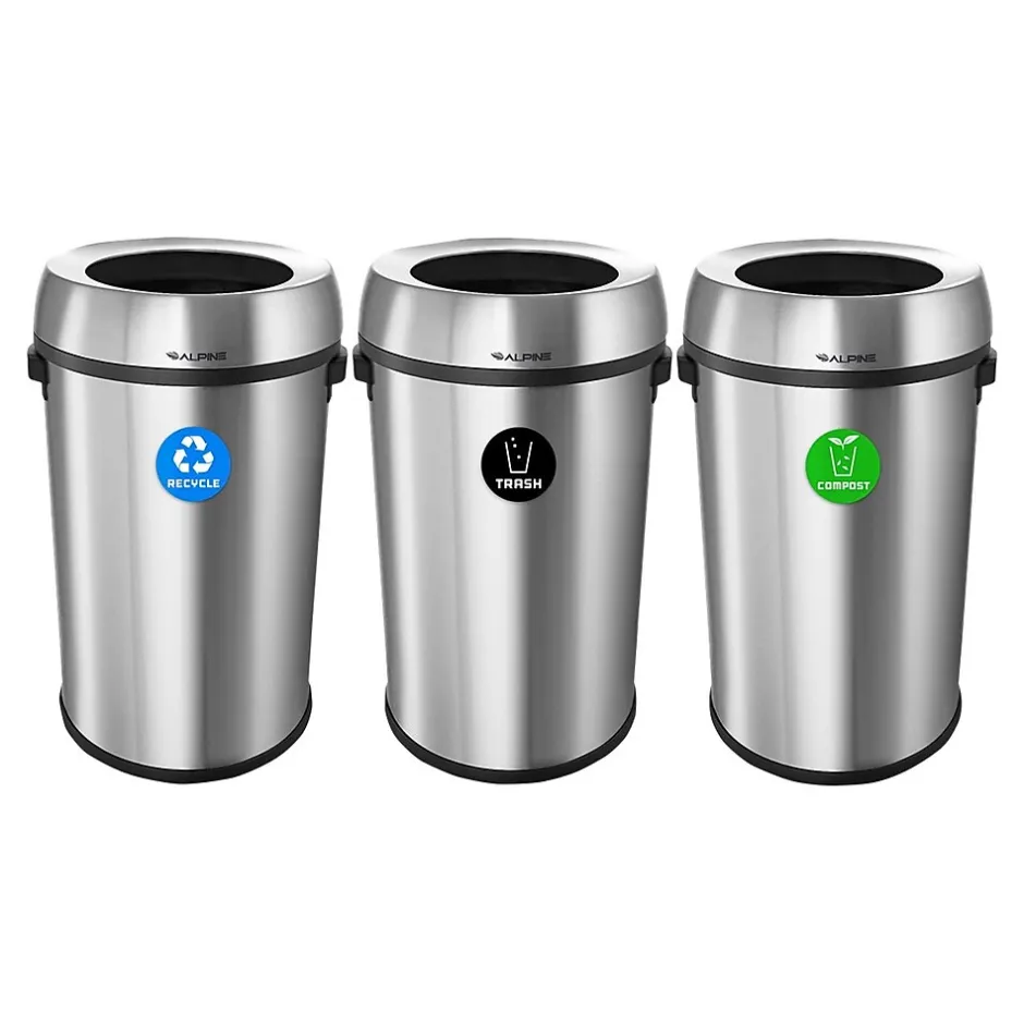 When equipping your business’s interior with waste receptacles, you want to be reassured it will survive constant daily use and also will aesthetically add to your environment. With our modern, multi-stream waste management 17 Gallon Stainless Steel Open Top Recycling, Trash and Compost Stations, you can be confident you’re getting an everlasting product that will help maintain cleanliness in your facilities. To help accommodate a more significant amount of recycling, trash and compost, the 17-gallon capacity can fulfill your foot traffic demands. Included with every purchase is a recycling, trash and compost sticker that will identify its intended purpose and be able to handle daily wear and tear. The vibrant colors of the stickers offer optimal visibility, assuring waste goes into the proper stream. In addition, the lids of the receptacles are created to display a seamless design that conceals trash bags but can efficiently be removed when needed. The large open top design of the lid will also allow precise disposal of all forms of waste. Our 17 Gallon Stainless Steel Open Top Recycling, Trash and Compost Stations, will allow you to streamline waste collection in your high-traffic area while adding a touch of modern appeal.