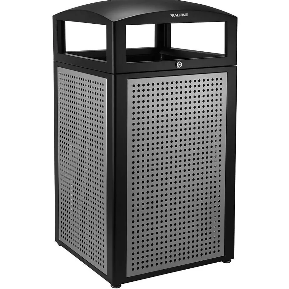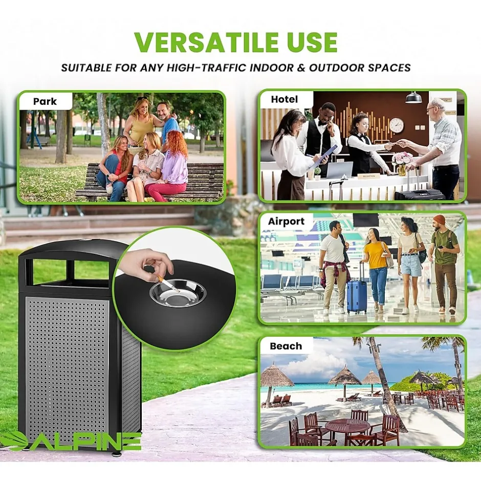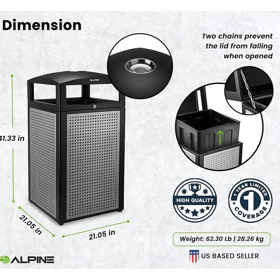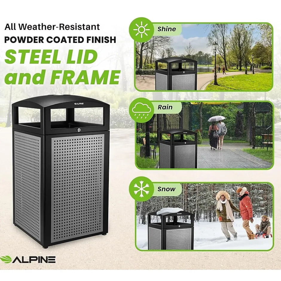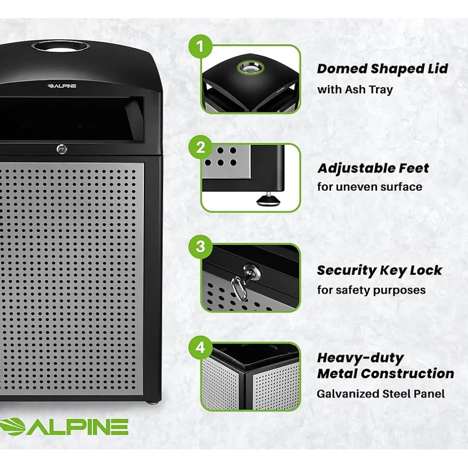 The Alpine Industries Rugged Steel 40 Gal. All-Weather Trash Containers are the perfect solution to keeping your high traffic areas tidy at picnic grounds, food courts, ballparks, outdoor dining areas – any indoor or outdoor venue where food or beverages are served. Water-shedding, domed, lockable lid has generous openings on all 4 sides to receive refuse from any direction. Equipped with a piano hinge and dual chain retainers for secure support, the lid opens wide, giving easy access to quickly remove and replace trash bags from the separate, leak-proof, washable liner. Stainless steel ashtray for extinguishing butts before disposal.