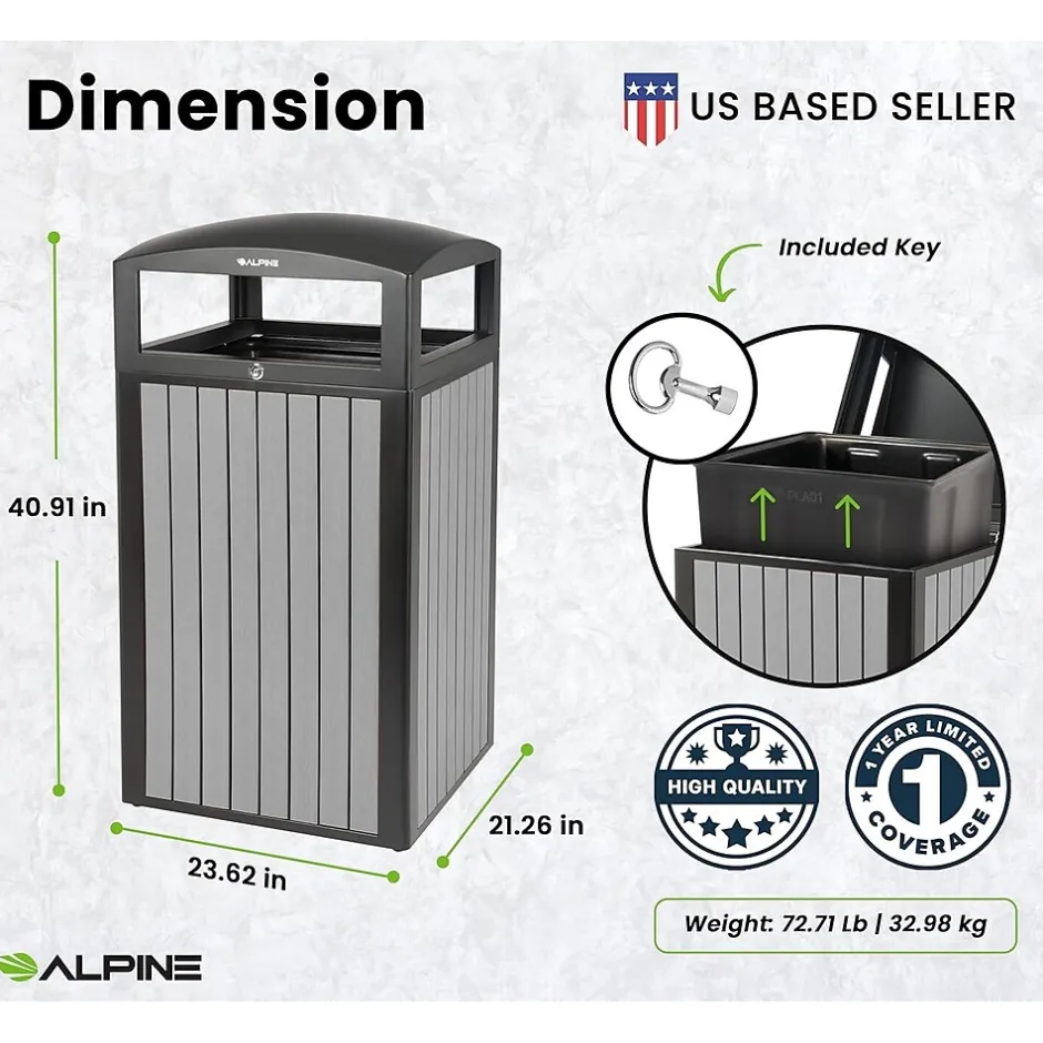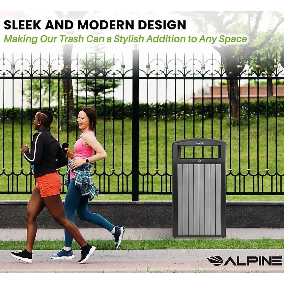 With this Alpine 40 gal. outdoor trash container, you can be confident you’re getting the most bang for your buck on a long-lasting product. Its weather-resistant powder-coated steel frame and lid will ensure its longevity while maintaining its quality. With an appealing exterior, this trash container consists of recycled plastic slats that add a warm and natural aesthetic to its surroundings. Additionally, its solid dome lid allows for rain to glide off easily and not pool, decreasing the likelihood of corrosion. The included heavy-duty plastic interior bin will securely hold trash bags without the worry of leaks. It’s a no-brainer to outfit your facilities with this superior trash container with all these fantastic features.