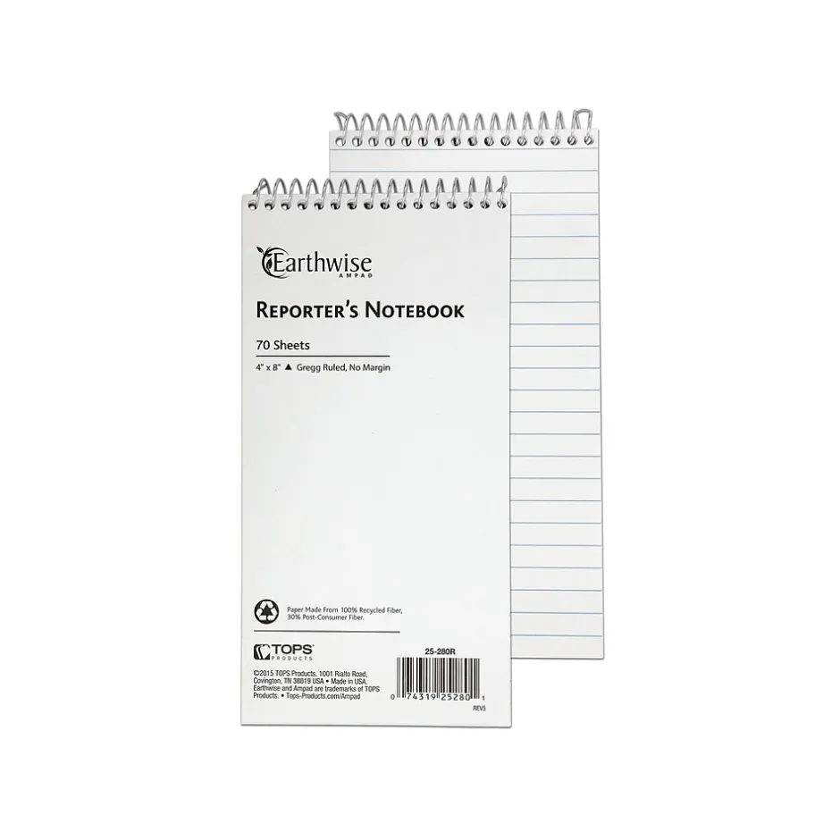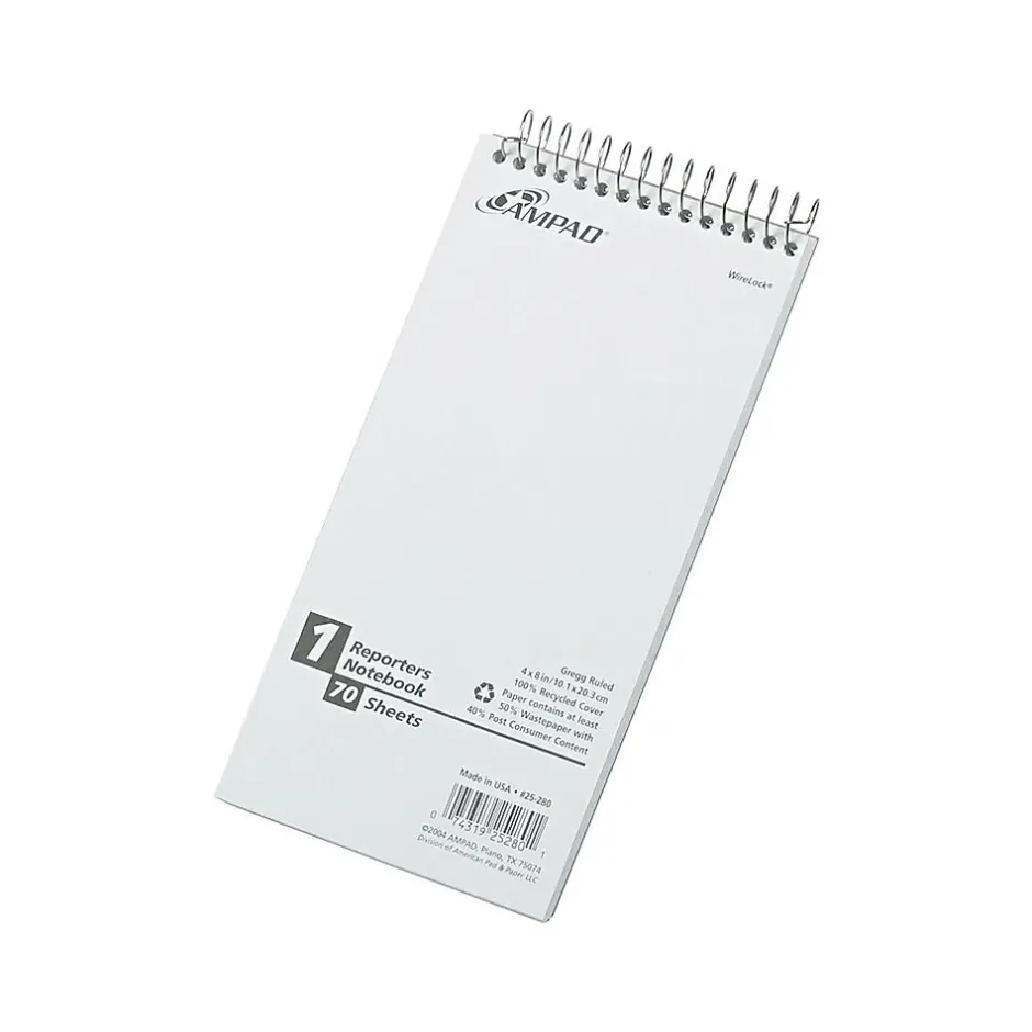 Take accurate notes for stories and reports with these Ampad Greencycle reporters notebooks. The Gregg-rule format lets you fit more information on every page, and the wire-bound tops make it easy to refer back to previous pages of notes. Each notebook features a compact size that rests perfectly in hand. With a sturdy recycled backing, these Ampad Greencycle reporters notebooks offer a durable writing surface.