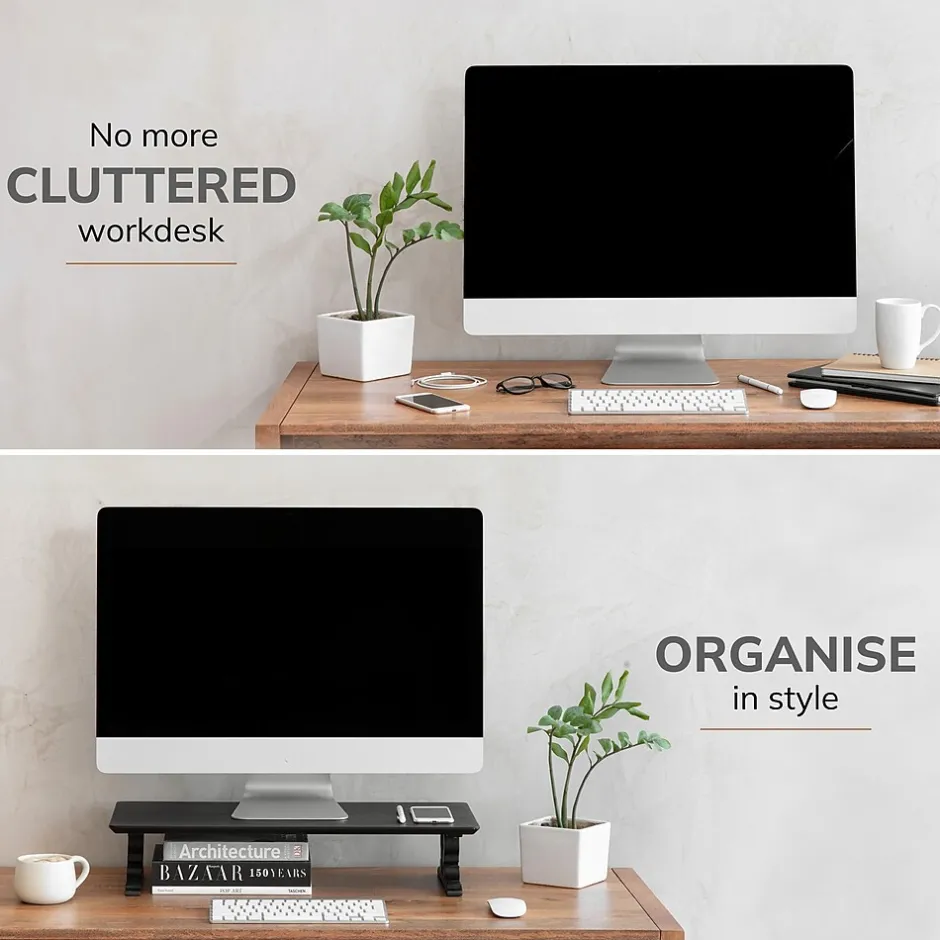 Tired of a cluttered and uncomfortable workspace? Anji Mountain’s inspired Monitor Stands are the solution you’ve been searching for. Crafted from sustainable and solid acacia wood with a rich black finish, these stands boast a traditional design with integrated legs that complement any décor. Enhance your comfort and productivity by elevating your screen to an ergonomic height, reducing neck and eye strain. The anti-skid EVA foam foot pads ensure stability, while the finger joint construction guarantees durability. This sturdy stand supports up to 22 pounds, helping you create the perfect workspace for your needs.Upgrade your workspace today with the modern elegance and functionality of Anji Mountain’s Monitor Stands.