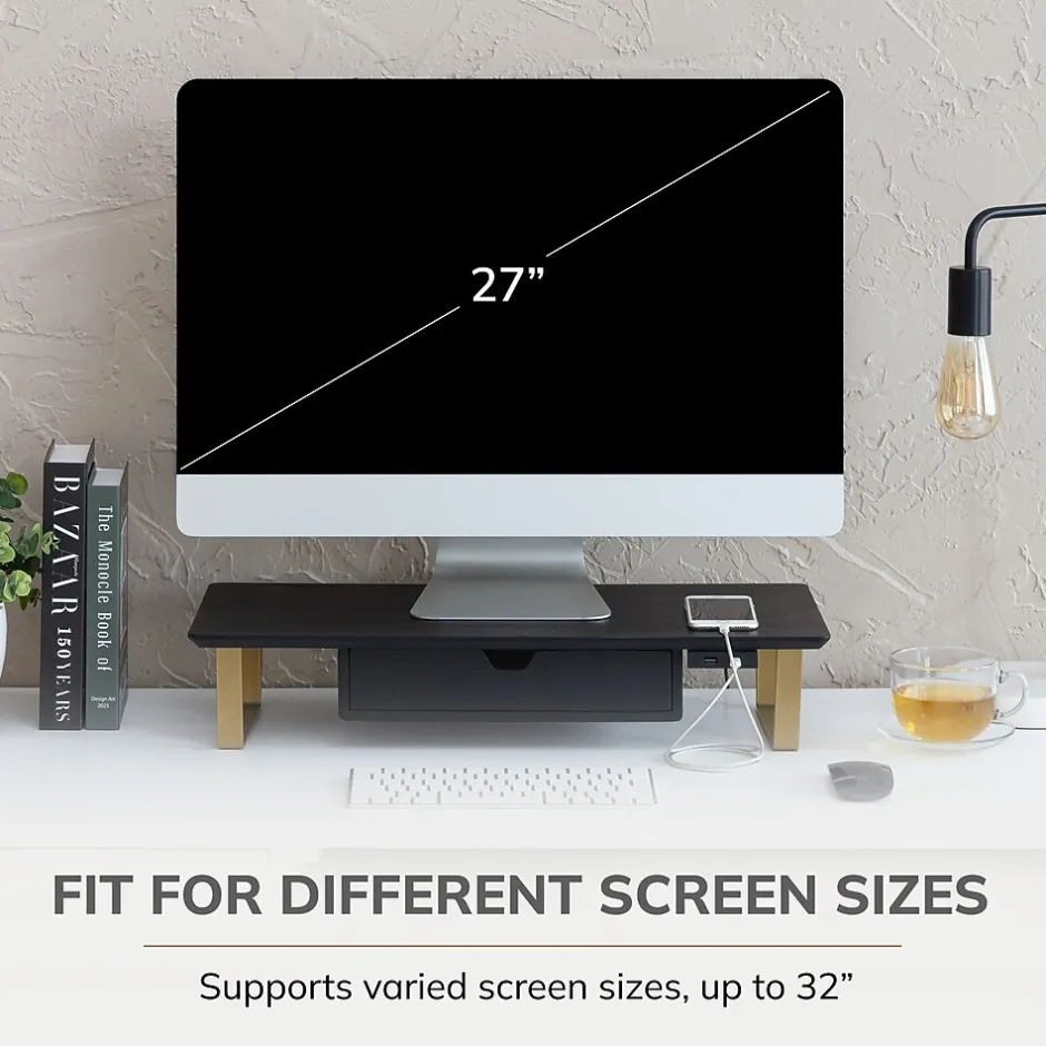 Tired of neck pain and clutter? Anji Mountain’s Monitor Stands are here to revolutionize your workspace. Our ergonomically designed stands feature a rich black stained acacia wood top and sturdy steel legs, elevating your monitors to the optimal height for reducing strain and discomfort. Say goodbye to a messy desk! The built-in drawer provides a convenient storage solution for your work essentials, helping you maintain a clean and focused workspace. Built-in dual USB outlets (Type A and Type C) for easy charging of your devices, streamlining your setup even further. Whether you’re a student, professional, or casual computer user, Anji Mountain’s Monitor Stands offer a simple yet impactful way to improve your comfort, productivity, and overall well-being. Upgrade your workspace today and experience the difference!
