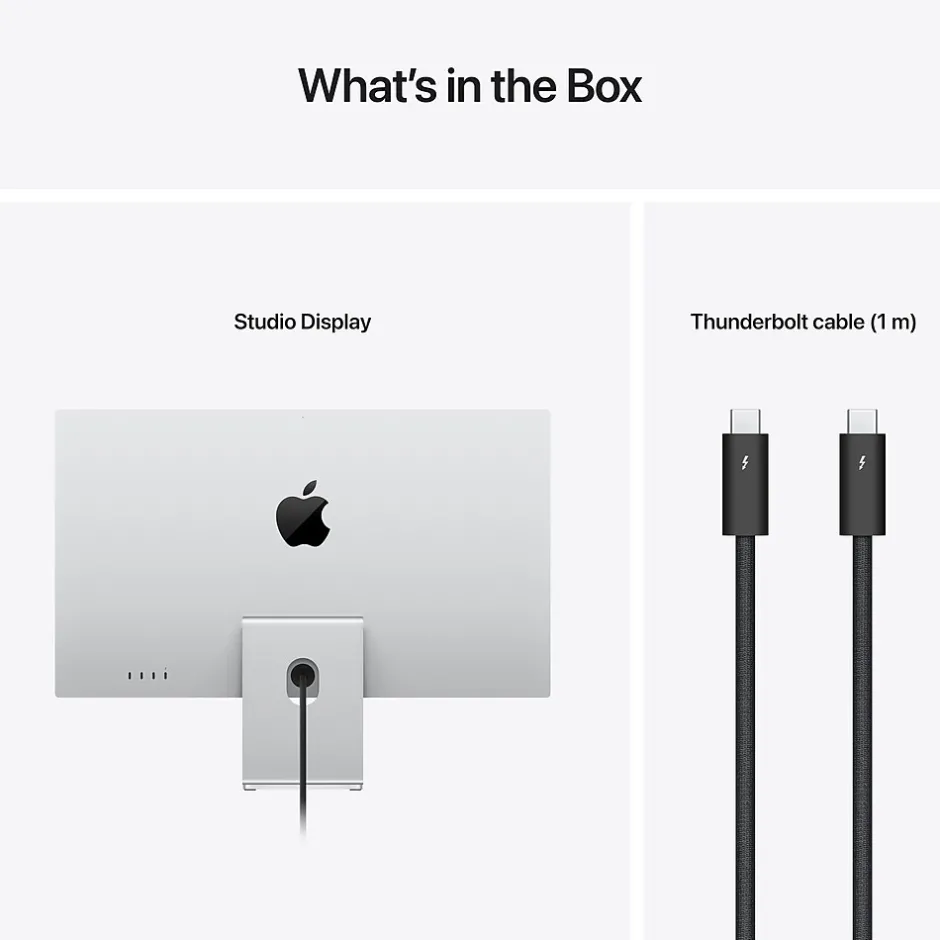 - What’s in the Box: Studio Display with standard glass and tilt adjustable stand, Thunderbolt cable (1 m)