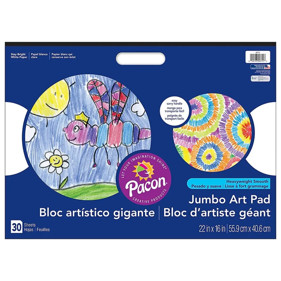 The giant size art and activity floor pad features a die-cut handle for portability. 30 Sheets of white paper are great for doodling, coloring and drawing. Recyclable. Measures 22″ x 16″. Each pad includes 30 sheets. Sold as a pack of 3 art pads.