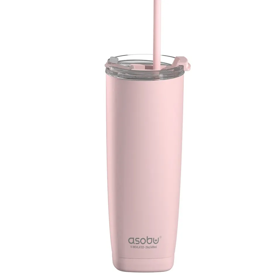 The Pink Aquilina from Asobu is a 20-oz., double-wall stainless steel tumbler, with a dual-purpose lid. It can accommodate either hot or cold drinks. Open the middle hole and insert the included straw for cold drinks. For hot drinks, use the flip-over lid covering. It keeps drinks cold up to 24 hours or hot up to 6 hours. It fits into a standard vehicle cupholder.