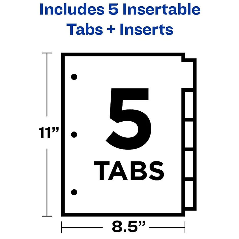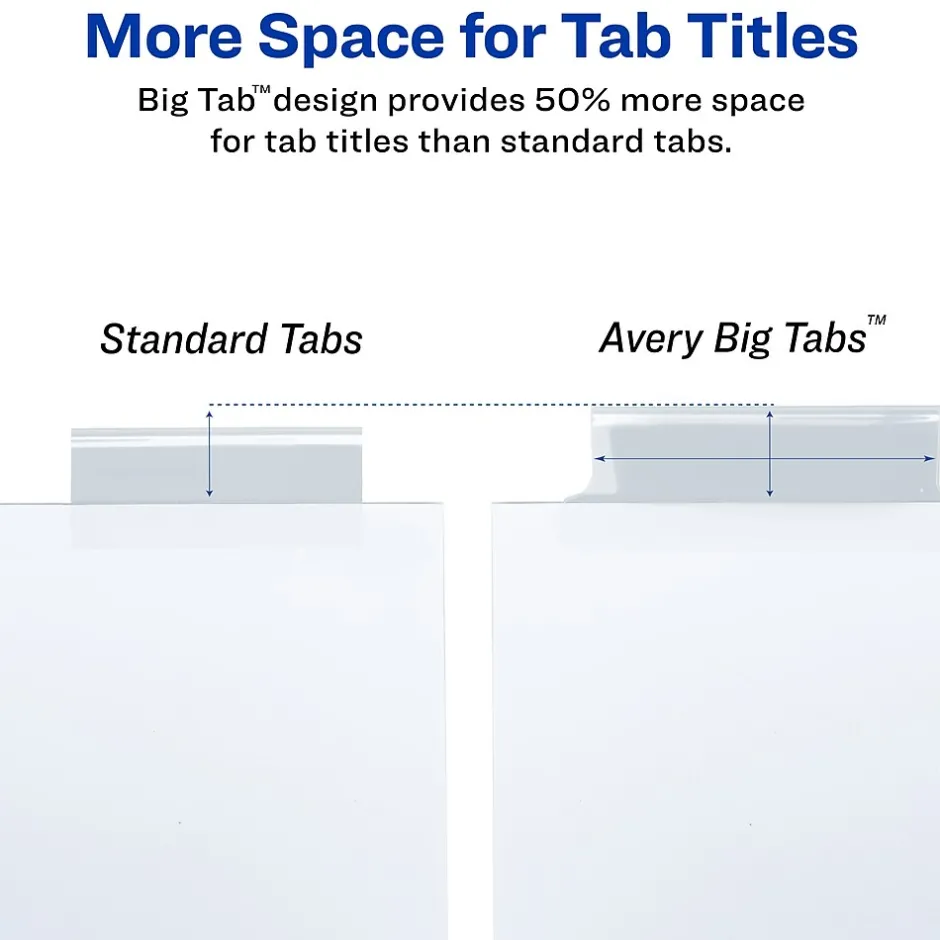 Organize paperwork by client, employee or department with these Avery Big Tab insertable dividers. Each divider comes pre-punched and ready for use in binders, while the double-sided reinforced edges resist tearing. The big tab design provides ample room for custom-printed labels, ensuring easy readability. These Avery Big Tab insertable dividers feature unique tab covers that prevent labels from falling out, keeping your document filing system neatly in place.