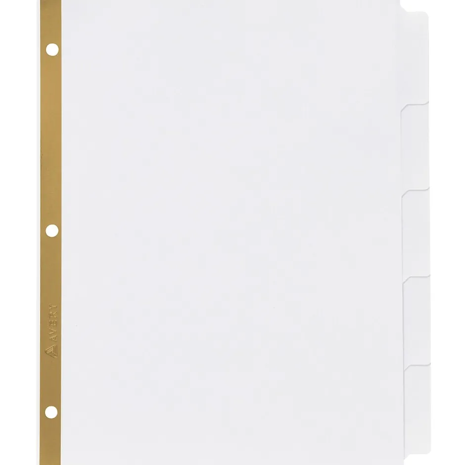 Get your classification folders organized quickly and easily with these Big Tab(TM) Write & Erase Dividers for 2-Prong Classification folders. Organize legal file folders and medical files quickly and easily with these writable dividers. Organize medical charts, patient or client forms, test results and lab work. Also great for personnel or tax files. The dividers are two-hole, top-punched for classification folders, with copper reinforcement for extra durability against metal prongs. Great for quick reference. Write, erase and reuse. Tabs are 50% bigger than standard tabs to provide more space for writing. Label the tabs with ease using either ballpoint pen or pencil. The 5-tab dividers are two-hole top punched for use with 2-prong fastener folders or classification folders. Side tabs allow for quick identification. Durable, reinforced fastener holes protect against wear and tear. Single side copper reinforced holes provide extra tear resistance against folder’s sharp prongs. File folder dividers help you to create additional filing surfaces as needed in any fastener folder or classification folder. Customize your table of contents page with free, easy-to-use templates and designs at avery.com/print. Select the one that best suits your project, enter section titles directly in your computer, add a logo or title, and print from your laser or inkjet printer. It’s so simple.
