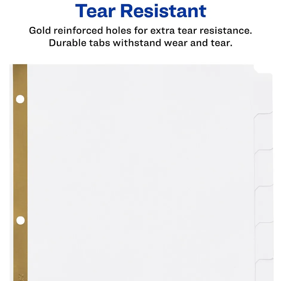 Subdivide papers with these white erasable eight-tab write-on dividers. The erasable design lets you reuse each tab as often as needed, while the gold-colored reinforced holes prevent these dividers from ripping out. These Avery erasable eight-tab write-on dividers are three-hole-punched and can be used with almost any standard three-ring binder, while the Big Tab design offers 1.5 times more space than standard tabs for labeling.