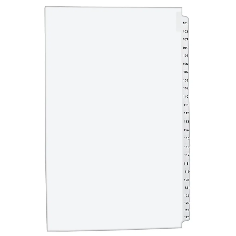 You have the right to organized and professional-looking files. This Standard Collated Legal Divider Set features Tabs 101-125 so it’s perfect for index briefs, legal exhibits, mortgage documentation files and more. White paper stock with clear, Rip Proof(TM) reinforced tabs are preprinted on both sides using Helvetica bold type for ease of use, and the unpunched binding edge gives you the freedom to fit practically any binding system. Here’s evidence these dividers will do your files justice.