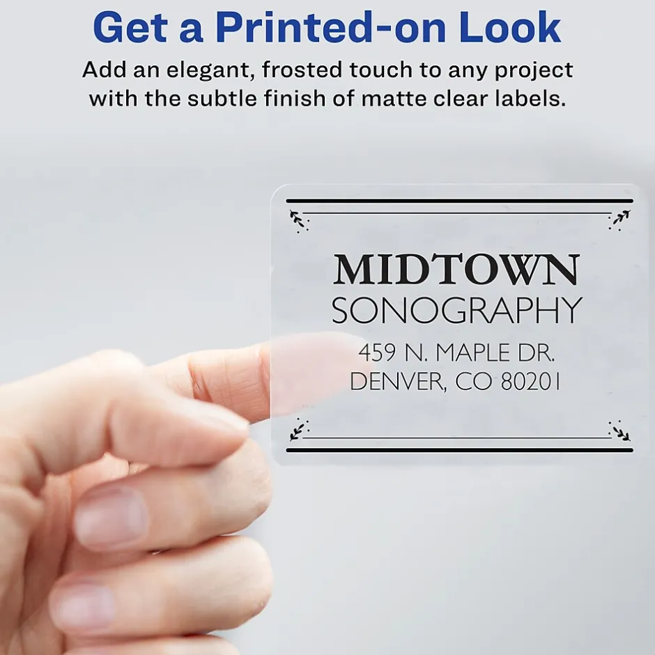 Tackle large mailing projects with ease using these Avery Easy Peel clear shipping labels. These labels have an Easy Peel design that lets you remove them from the sheet and stick them where they’re needed without difficulty. Avery Easy Peel clear shipping labels are virtually invisible once applied, giving mail a smooth printed-on appearance. These labels also feature exclusive Avery Sure Feed technology to improve print alignment and avoid jamming.