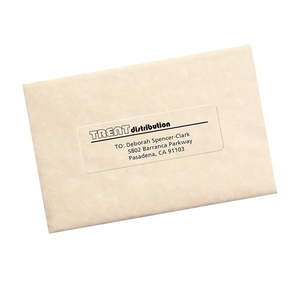 Do your packages and envelopes need a shot of sophistication? This pack of Avery(R) matte clear address labels is the clear choice for sprucing up ordinary packaging and mailing. These matte clear labels basically disappear when applied to white, light-colored or textured paper. Use these clear labels on vellum envelopes and glassine bags to create a printed-on appearance. These labels also feature exclusive Avery(R) Sure Feed(R) technology to improve print alignment and avoid jamming. The blue, textured strip on the top of each sheet provides better grip for printer rollers and helps feed the sheet through your printer. Ultrahold(R) permanent adhesive makes sure that these labels stick and stay without peeling, curling or falling off. Once applied, the permanent adhesive makes sure that the label holds fast to a variety of surfaces including paper, plastic, cardboard, film, painted metals and glass. The proprietary Easy Peel(R) label technology makes sure that these clear address labels are easy to peel and quick to apply. Just bend the label sheet, peel off your labels and fold the sheet back flat. These Avery(R) mailing labels are easy to use and make it simple to customize your envelopes, invitations and product packaging with an elegant flair. Avery(R) Design & Print also makes it straightforward to create beautiful, personalized labels from your own home or office. The free browser-based design software has all of the tools you need to create address labels, wedding invitations, product branding and more. Try it out today at avery.com.templates. Please Note: These labels are optimized for use with laser printers only. Using these sheets with inkjet printers may cause the print to smear.