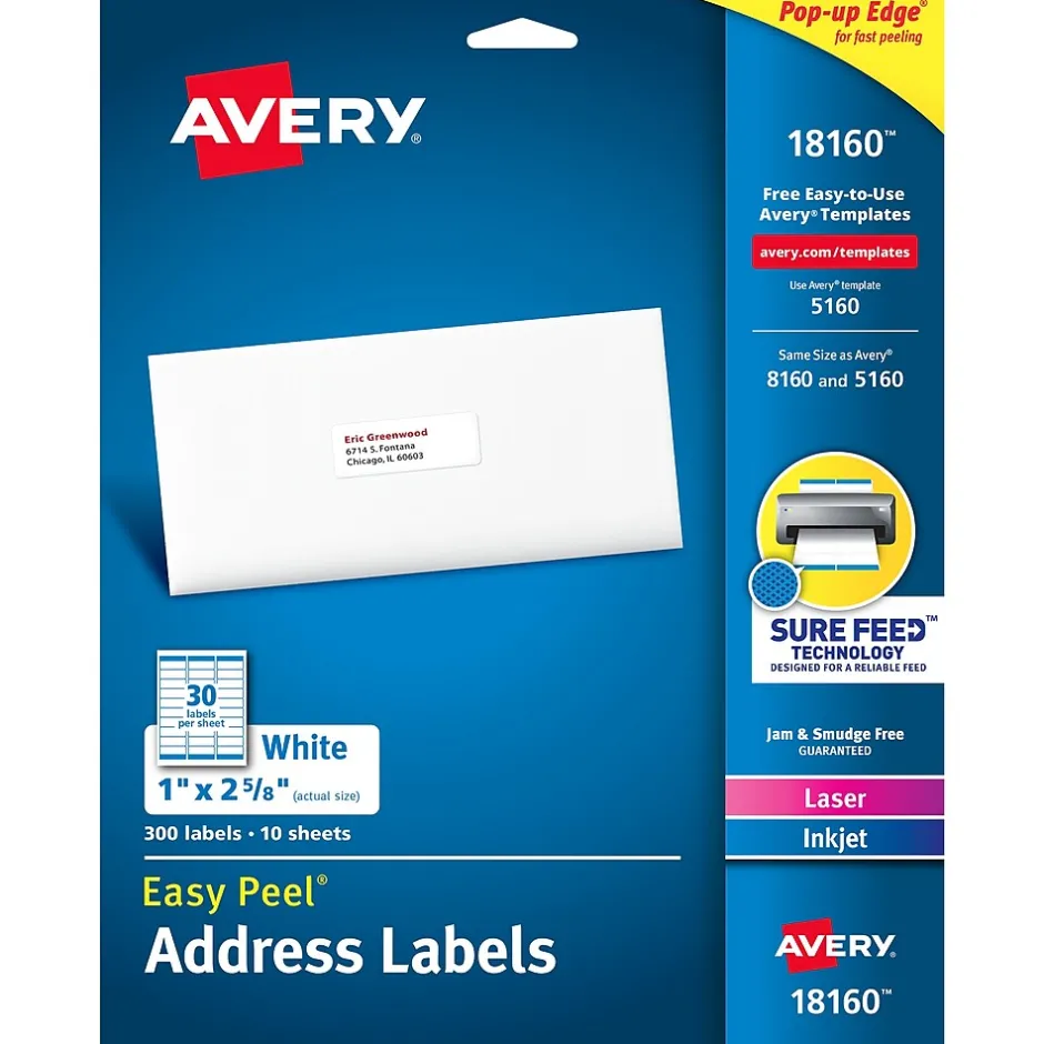 Take charge of all your mailing, shipping, identification and organization jobs with Avery(R) address labels. Avery(R) bright white labels blend better than basic labels on white envelopes. Avery(R) labels provide better adhesion than basic labels with its Ultrahold(R) permanent adhesive that sticks and stays, guaranteed. Printers aren’t perfect, so we did something about it: These mailing labels are optimized for laser & inkjet printers and use Sure Feed(R) technology to deliver a more reliable feed through your printer and prevent misalignments and jams. Never waste another label! These address labels have an Easy Peel(R) design for fast application. They’re great for organization labels, classroom labels, personalized gift tags for your wrapping paper, party favors or holiday cards. They’re also excellent for product packaging, filing, organizing items in your office, kitchen, closet, garage and classroom organization. Easily add that personal touch to your custom address labels with thousands of free designs using Avery(R) templates at avery.com/templates. Make your mailing jobs easy and efficient using this versatile pack of 300 label stickers.