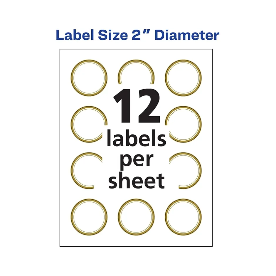 Remarkably reflective and elegant, Avery matte white round labels with metallic gold borders bring a strikingly radiant shine to any event or project. Each round label is pre-printed with a brilliant gold foil-like border that is guaranteed to capture people’s attention. Pair these labels with other Avery labels and cards with metallic gold borders for the complete look. Avery Easy Peel technology makes it simple to easily peel and place multiple labels quickly. Just bend back the label sheet to expose the pop up edges and peel away each label without risking ripping or tearing. Using a strong permanent adhesive, every label can stick and stay to a variety of surfaces including envelopes, cardboard, paper, glass, metal and more. Create beautiful designs and make your own mailing seals, mason jar labels, product labels, food labels, party favor labels, save the date stickers and more using the free design software and templates at avery.com/templates. 120 labels are included with 12 labels per sheet on 10 sheets. Compatible with both laser and inkjet printers.