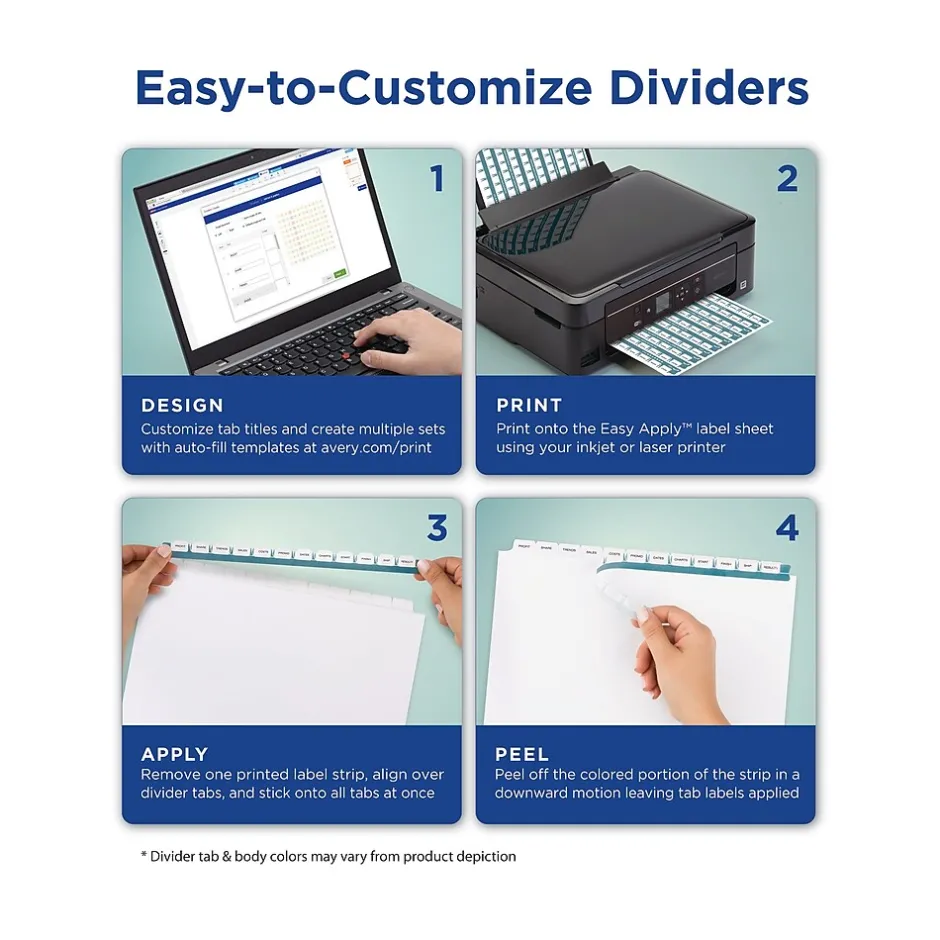 Whether you’re putting together a single project or multiple sets, these dividers let you to get it done quickly and easily, with professional results. They feature an innovative double-layer tab format that is easy to view and access. They’re ideal for large projects, training and reference manuals, policies and procedure manuals, budget binders and client binders where multiple tabs needed. The clear labels virtually disappear on the tabs, giving your dividers a clean, printed-on look. The Easy Apply strip lets you label all the tabs at once, making it simple to create custom dividers right from your computer. Just use the free templates at avery.com/print to easily personalize and print your tab labels in minutes.