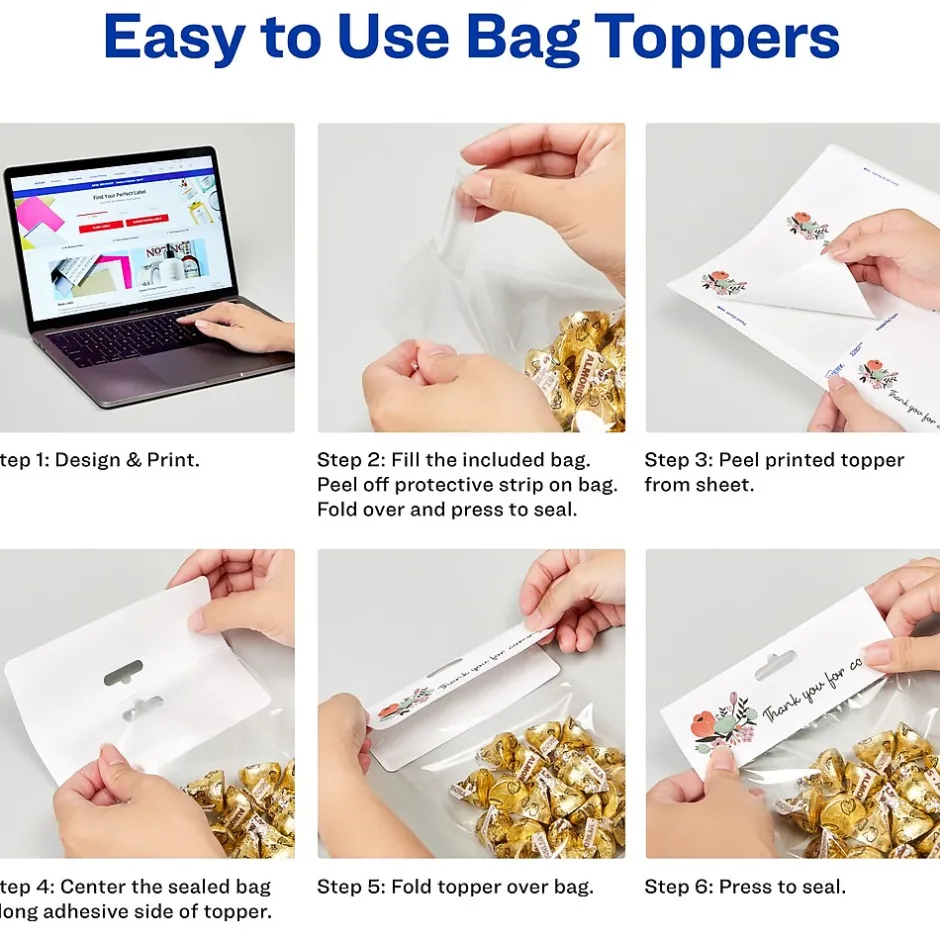 It’s in the bag! With self-closing bags and self-adhesive toppers you can create professional retail packaging for your merchandise or promotional giveaways with your brand and company information. The bags feature optional perforated holes to use on slot or peg hangers for easy merchandising. Each pack includes step-by-step instructions to make setup a snap. The full-sheet printable paper toppers are both laser and inkjet printer compatible so all you have to do is print it, bag it and tag it. Package includes bags and toppers with pre-applied adhesive for quick and easy assembly (do not use bags for food or in microwave). Label Size – text: 1 3/4 x 5; Label Color(s): White; Machine Compatibility: Inkjet Printers; Laser Printers; Sheet (W x L): 8 1/2 x 11.
