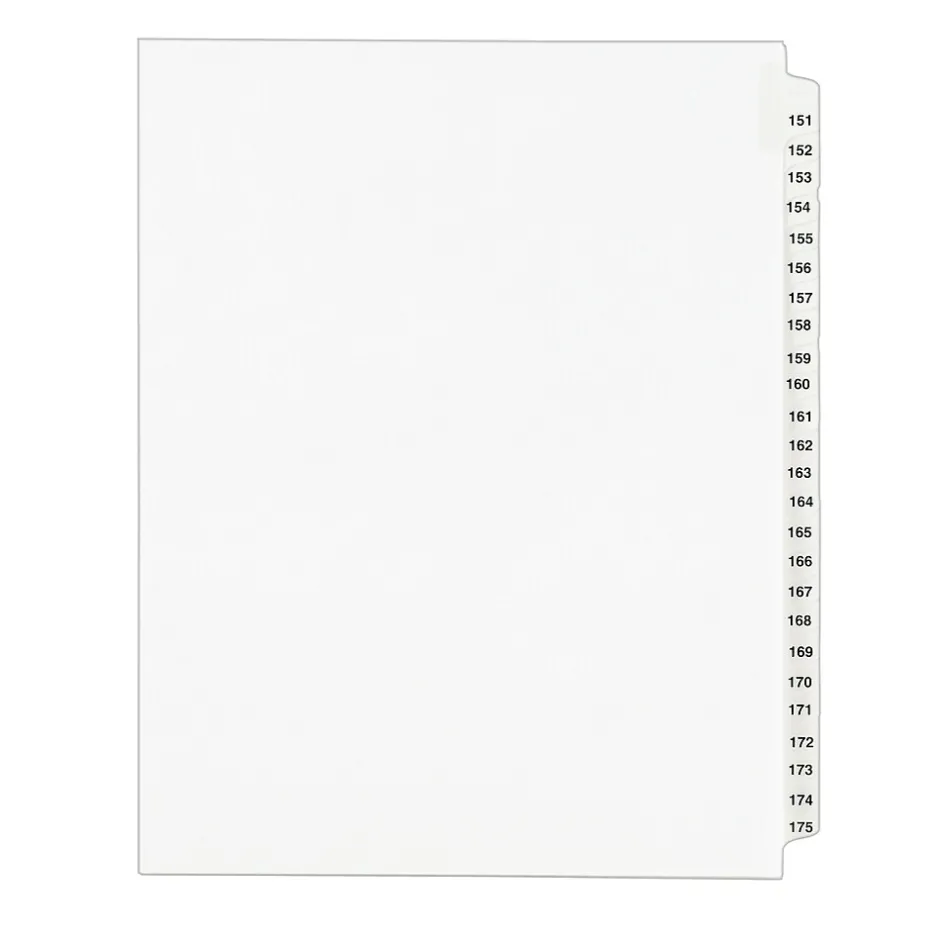 You have the right to organized and professional-looking files. This Standard Collated Legal Divider Set features Tabs 151-175 so it’s perfect for index briefs, legal exhibits, mortgage documentation files and more. White paper stock with clear, Rip Proof(TM) reinforced tabs are preprinted on both sides using Helvetica bold type for ease of use, and the unpunched binding edge gives you the freedom to fit practically any binding system. Here’s evidence these dividers will do your files justice.