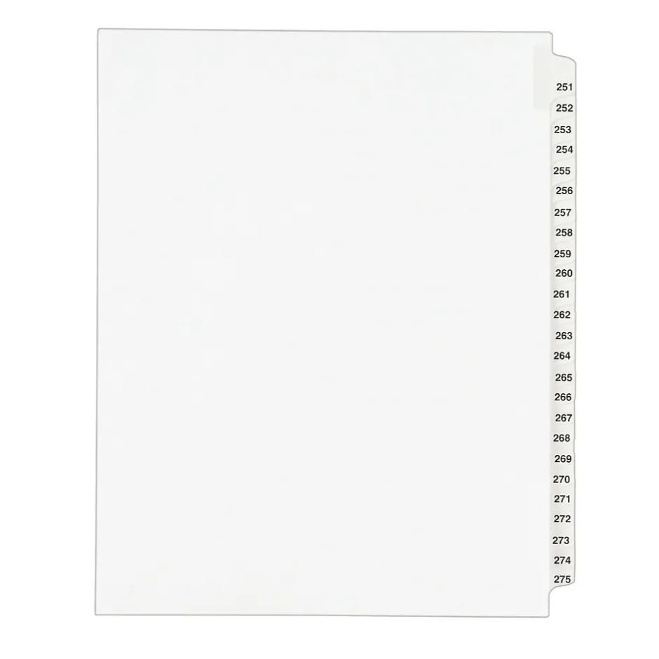 You have the right to organized and professional-looking files. This Standard Collated Legal Divider Set features Tabs 251-275 so it’s perfect for index briefs, legal exhibits, mortgage documentation files and more. White paper stock with clear, Rip Proof(TM) reinforced tabs are preprinted on both sides using Helvetica bold type for ease of use, and the unpunched binding edge gives you the freedom to fit practically any binding system. Here’s evidence these dividers will do your files justice.