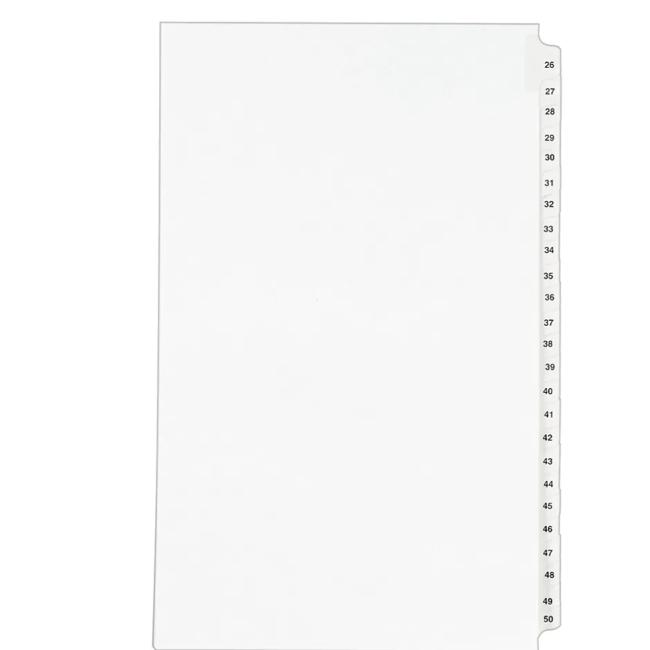 You have the right to organized and professional-looking files. This Standard Collated Legal Divider Set features Tabs 26-50 so it’s perfect for index briefs, legal exhibits, mortgage documentation files and more. 8-1/2″ x 14″ white paper stock with clear, Rip Proof(TM) reinforced tabs are preprinted on both sides using Helvetica bold type for ease of use, and the unpunched binding edge gives you the freedom to fit practically any binding system. Here’s evidence these dividers will do your files justice.