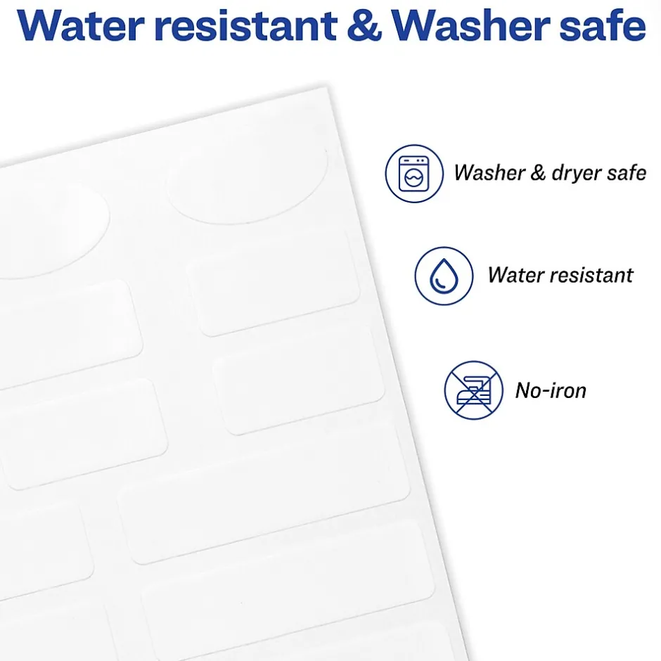 Make sure clothing and supplies always get returned to its rightful owner with Avery 40700 No-Iron Fabric Labels. Just handwrite on the clothes labels with a permanent marker, peel and apply. It’s that simple! Labels are not compatible with printers. The label’s white background makes it easy to see the writing on your label for quick and effortless identification. You don’t even have to worry about labels lifting, curling, or falling off thanks to permanent adhesive that is guaranteed to stay in place. The no-iron clothing labels are flexible and durable enough to withstand multiple cycles in your washer and dryer. Not only do they make great name labels for clothing for school, daycare, nursing homes and work, but their unique material allows you to apply the labels to other smooth surfaces. Use labels on office and school supplies, water bottles, lunch boxes, storage bins, cups and bottles, camping gear and more. Item includes a total of 45 matte white oval labels and rectangle labels in various sizes.