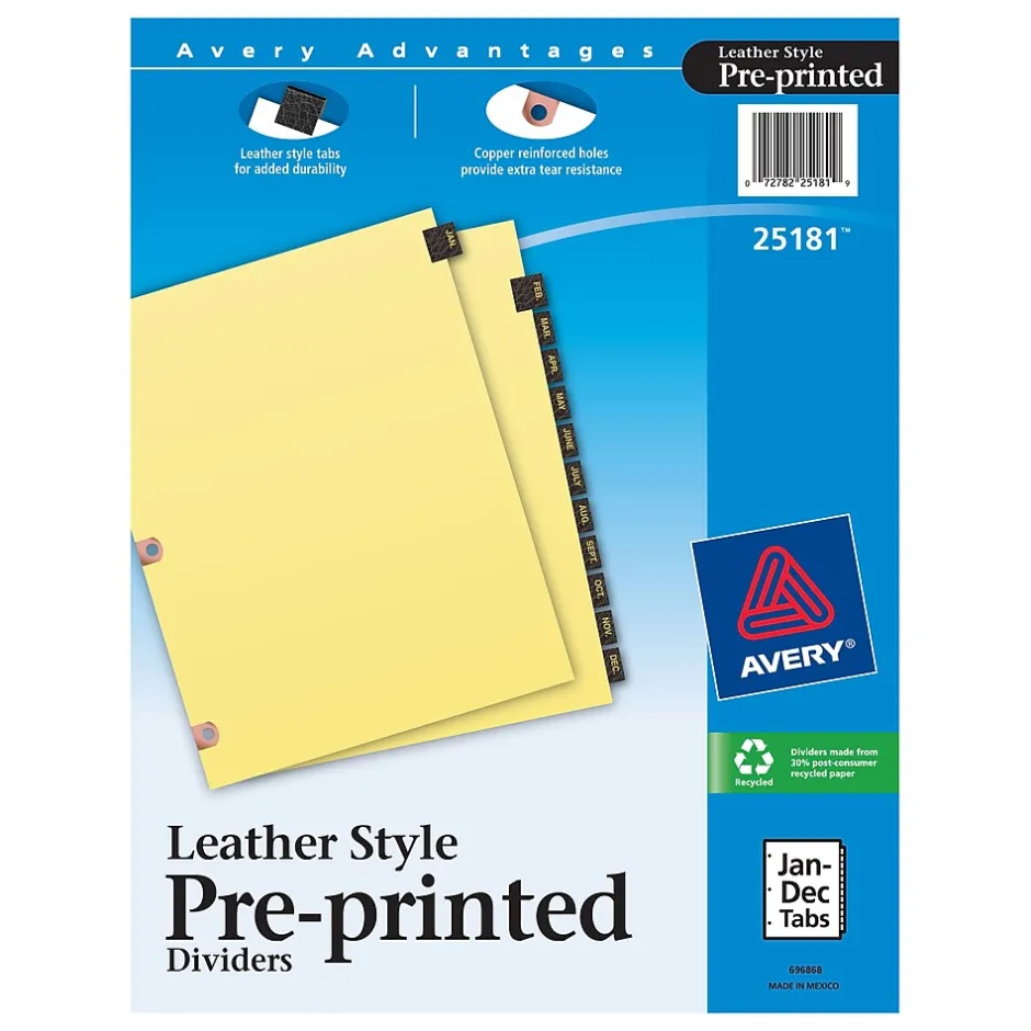 Manage your time efficiently with these Avery leather-style dividers. The months of January through December are printed on the dividers to help you plan and be productive, and the black leather and gold lettering on the tabs is both attractive and durable. The copper-reinforced three-hole punched binder holes of these Avery leather-style dividers are easily placed in a planner and resist tearing to last all year.