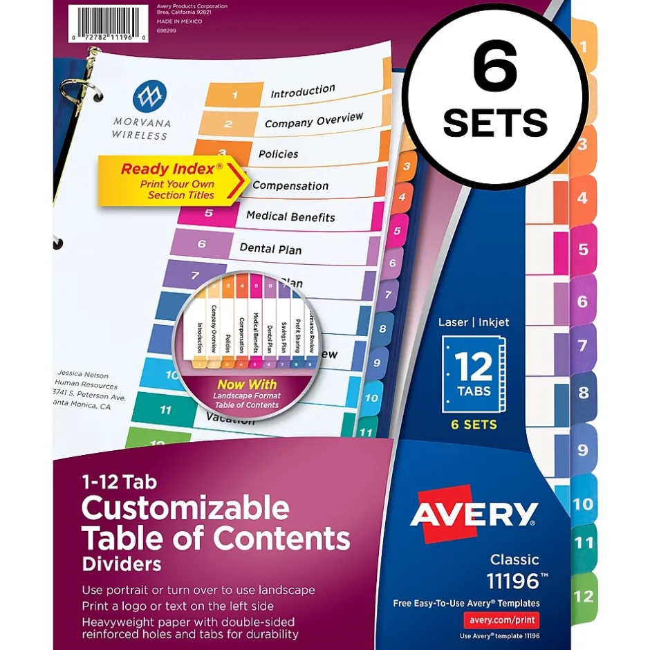Set up your binders with these Avery Ready Index 12-tab table of contents dividers. Free templates from Avery Design & Print let you customize dividers to your liking, while the two-sided section titles page and tab dividers let you use them in landscape or portrait orientations. These Avery Ready Index 12-tab table of contents dividers work great for any letter-size papers.
