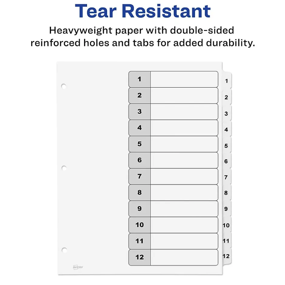 Organize your projects in moments with Avery Ready Index binder dividers. Each white tab is preprinted for a professional appearance. Print your own custom section titles and images onto the table of contents sheet without worrying about labels or inserts.Whether you’re creating planners for classes or hosting a presentation, these dividers are ideal for getting everything sorted.1 set of 12 divider are included with each sheet measuring 8-1/2″x11″. The 3 binder holes are reinforced on both sides of the heavyweight sheet to prevent creasing and tearing. Each divider tab includes additional reinforcement along the edge of each page to distribute stress and resist folding.The printable table of contents is dual compatible with both laser and inkjet printers.This sheet can also be printed in either portrait or landscape so that your projects can be displayed in any orientation.Just flip the sheet to view the other layout on the opposite side.Try out free templates for these dividers and check out the Avery Design & Print software at avery.com/templates