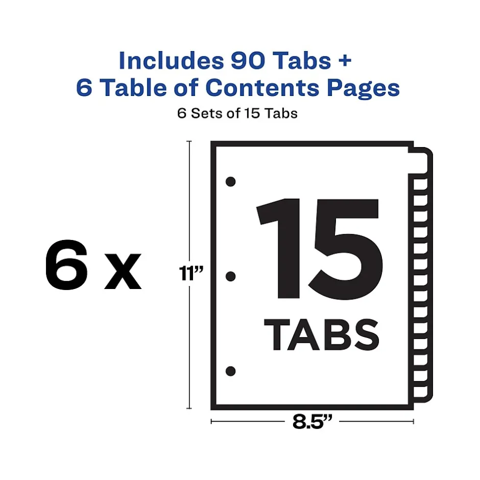 Organize your projects in moments with Avery Ready Index binder dividers. Each white tab is preprinted for a professional appearance. Print your own custom section titles and images onto the table of contents sheet without worrying about labels or inserts. Whether you’re creating planners for classes or hosting a presentation, these dividers are ideal for getting everything sorted.6 sets of 12 dividers are included with each sheet measuring 8-1/2″x11″. The 3 binder holes are reinforced on both sides of the heavyweight sheet to prevent creasing and tearing. Each divider tab includes additional reinforcement along the edge of each page to distribute stress and resist folding.The printable table of contents is dual compatible with both laser and inkjet printers. This sheet can also be printed in either portrait or landscape so that your projects can be displayed in any orientation. Just flip the sheet to view the other layout on the opposite side. Try out free templates for these dividers and check out the Avery Design & Print software at avery.com/templates