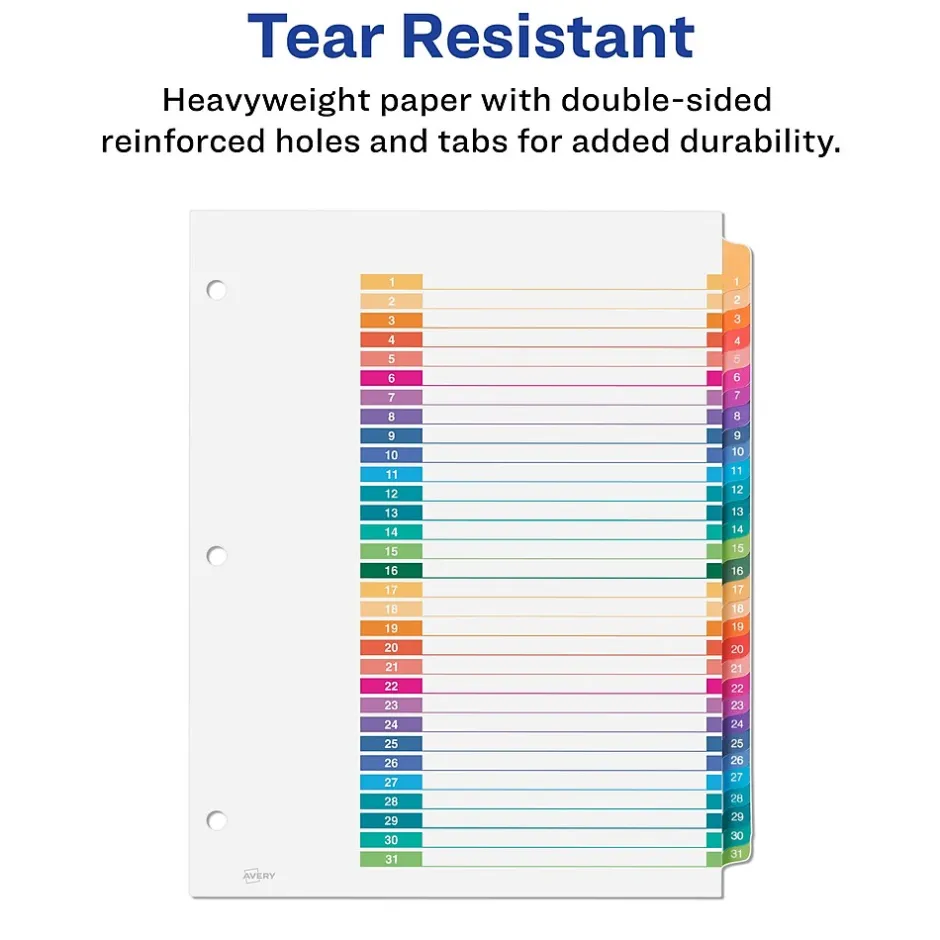 Organize your projects in moments with Avery Ready Index 12-tab monthly dividers. Each tab is preprinted and uniquely color coded for a professional appearance. Print your own custom section titles and images onto the table of contents sheet without worrying about labels or inserts. Whether you’re creating planners for classes or hosting a presentation, these dividers are ideal for getting everything sorted.6 sets of 12 tabbed dividers are included with each sheet measuring 8-1/2″x11″. The 3 binder holes are reinforced on both sides of the heavyweight sheet to prevent creasing and tearing. Each divider tab includes additional reinforcement along the edge of each page to distribute stress and resist folding.The printable table of contents is dual compatible with both laser and inkjet printers. This sheet can also be printed in either portrait or landscape so that your projects can be displayed in any orientation. Just flip the sheet to view the other layout on the opposite side.Try out free templates for these dividers and check out the Avery Design & Print software at avery.com/templates.