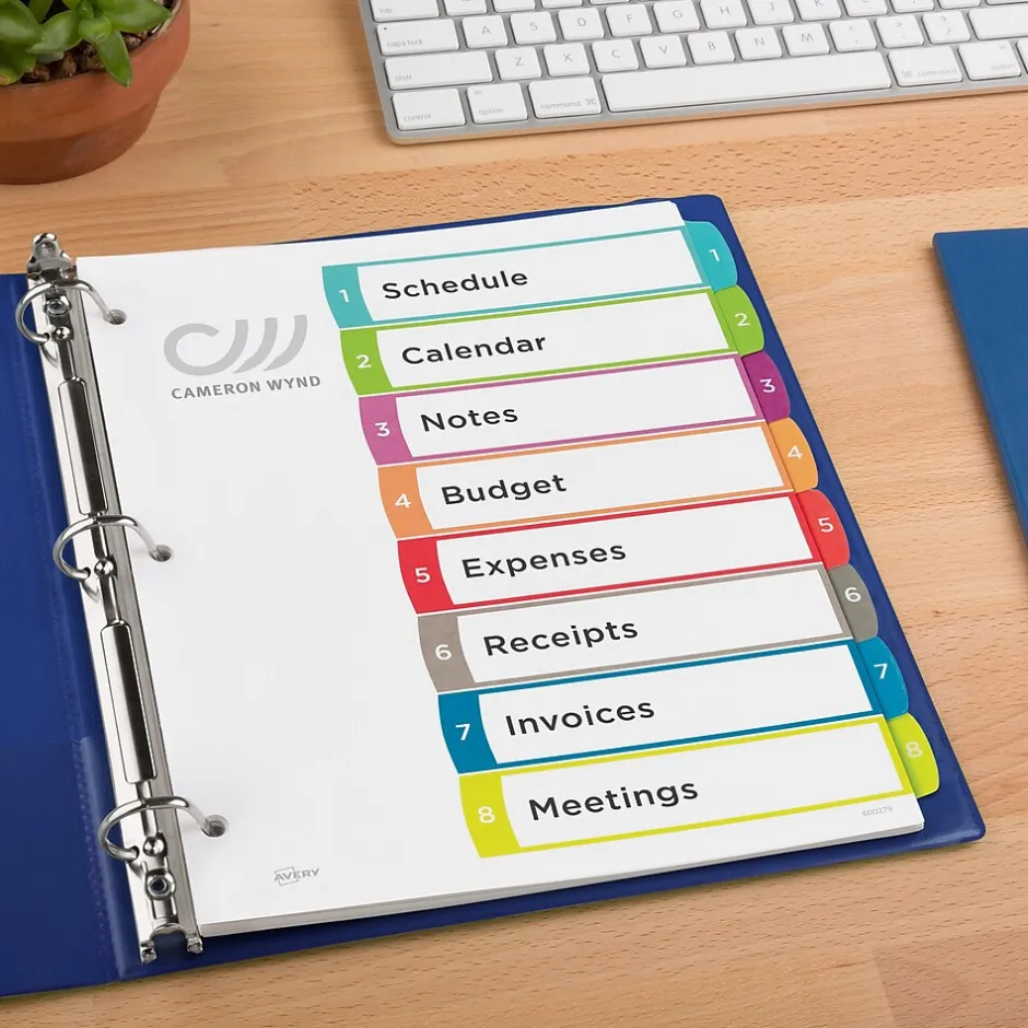 - Securely insert the 3 hole-punched paper dividers into your favorite 3 ring binder