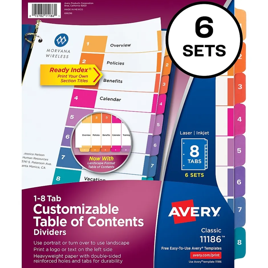 Organize your projects in moments with Avery Ready Index 8-tab dividers. Each tab is preprinted and uniquely color coded for a professional appearance. Print your own custom section titles and images onto the table of contents sheet without worrying about labels or inserts. Whether you’re creating planners for classes or hosting a presentation, these dividers are ideal for getting everything sorted.6 sets of 8 tabbed dividers are included with each sheet measuring 8-1/2″x11″. The 3 binder holes are reinforced on both sides of the heavyweight sheet to prevent creasing and tearing. Each divider tab includes additional reinforcement along the edge of each page to distribute stress and resist folding.The printable table of contents is dual compatible with both laser and inkjet printers. This sheet can also be printed in either portrait or landscape so that your projects can be displayed in any orientation. Just flip the sheet to view the other layout on the opposite side. Try out free templates for these dividers and check out the Avery Design & Print software at avery.com/templates.