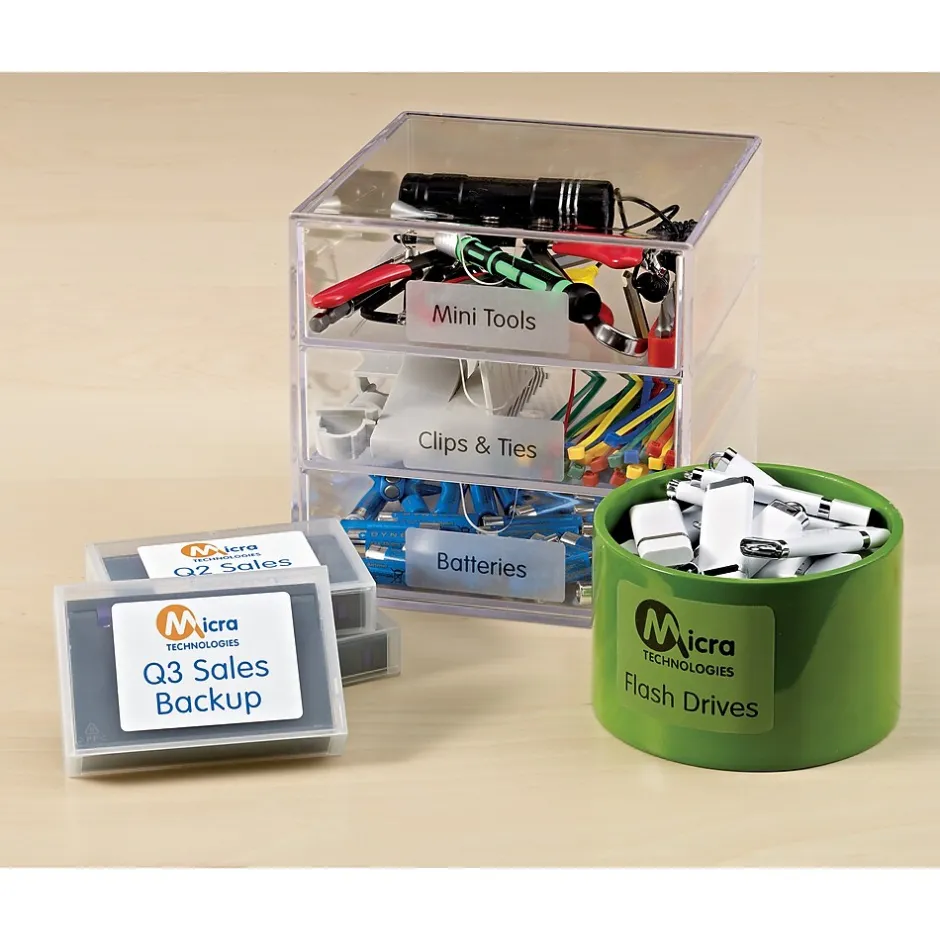 - Multiuse labels make it easy to create identification labels for storage boxes, containers, office or classroom equipment and personal or company property