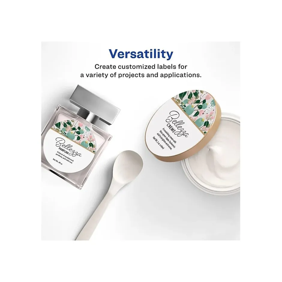 Make sure your handmade gifts and products stand out with Avery 22891 glossy white 3″ diameter round labels that offer the professional finishing touch you need. Glossy Avery labels feature a beautiful photo-quality shine that adds an elegant glimmer to mailing seals, food labels, body butter labels, candle labels and more. Create your own unique designs with hundreds of customizable Avery templates. These glossy round labels also feature exclusive Avery Sure Feed technology to improve print alignment and avoid jamming. The blue, textured strip on the top of each sheet provides better grip for printer rollers and helps feed the sheet through your printer. The patented Easy Peel label design makes these labels easy to peel and quick to apply. Just bend the label sheet, peel off your labels and fold the sheet back flat. The permanent adhesive ensures that your labels stick and stay without curling, peeling or falling off. Smudge-proof when used with inkjet and laser printers.