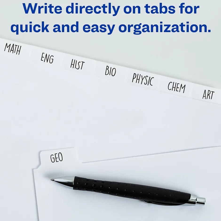 Avery white write-on tab dividers with non-laminated tabs give staffers a chance to make informal notebooks at the office, including ordinary employee logs, pertinent customer data, guestbooks and informal photo journals. Heavyweight construction works well for everyday use when you need to organize information. Tabs are wide enough to write one entire word in big letters or two to three words in smaller letters. These dividers are reusable by just erasing your pencil or pen marks.