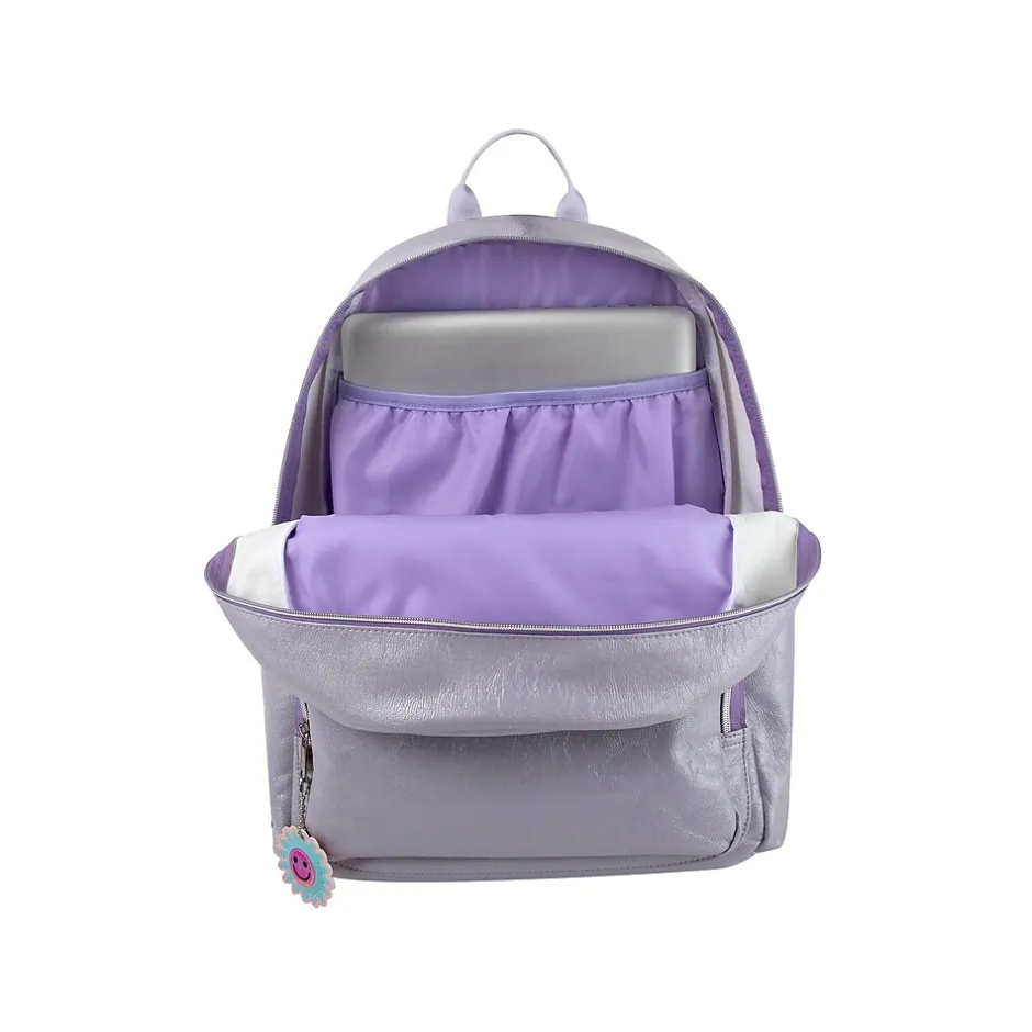 The Jessica Simpson modern everyday backpack has it all. Perfect for travel or school: pack everything you need from clothes and shoes to school books and documents in the large main compartment, and tuck away snacks, cell phone, hand sanitizer, passport, and even cash in its secure outer pockets. The soft padded straps and back ensure constant comfort, and the top carry handle lets you switch it up to carry the backpack anywhere. Plus, a bonus decorative key chain gives your bag a unique flair of its own.