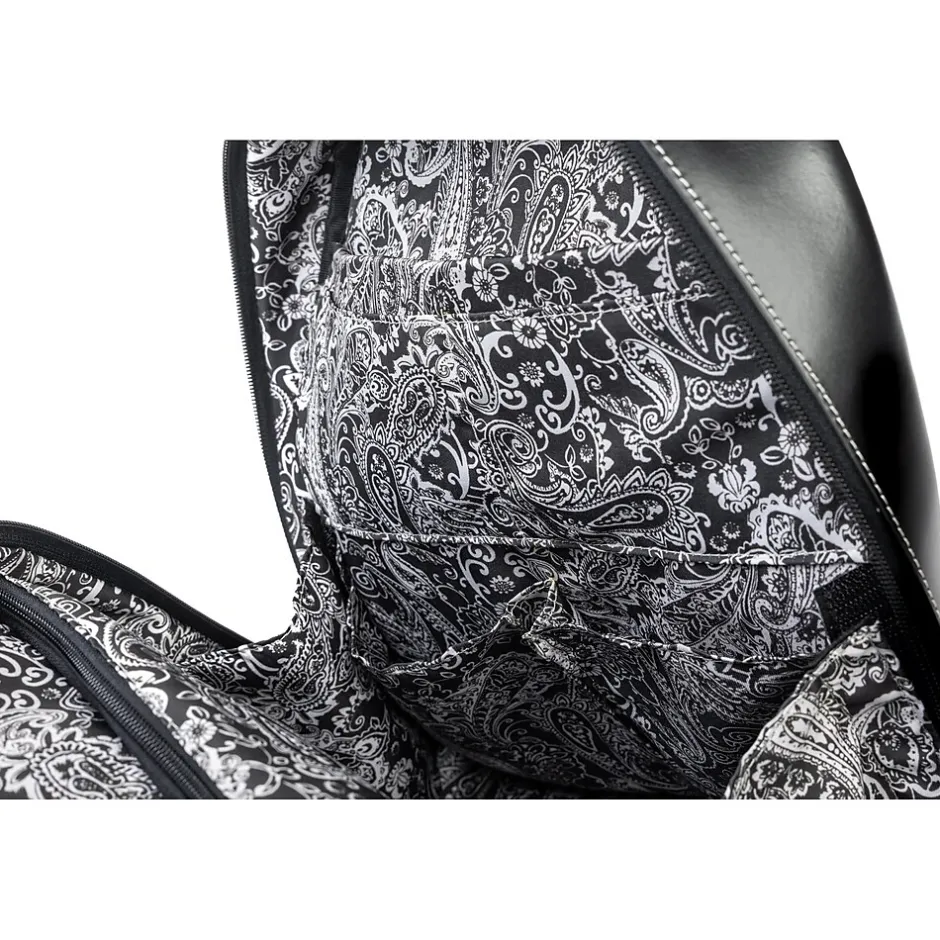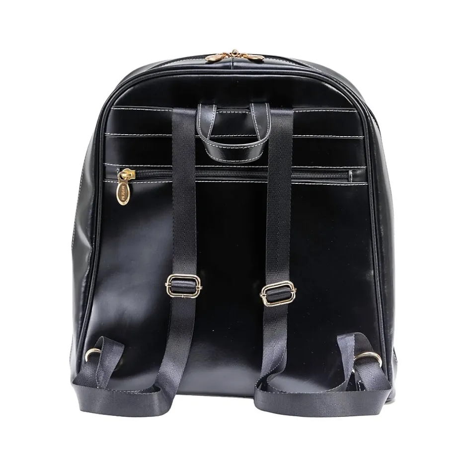 This McKleinUSA MADISON business laptop/tablet backpack features a front pocket with a magnetic clasp and a belt design on the front pocket, front zipper pocket, interior laptop pocket and tablet pocket, interior zipper pocket, four slip pockets for power cords, plugs, and accessories. The main compartment features a wide opening, with the ability to unzip all the way down on each side. The interior is fully lined, complete with hardware in a gold-tone finish. The backpack also features adjustable straps and a handle hook for carrying or hanging. Comes with protective metal feet on the base.