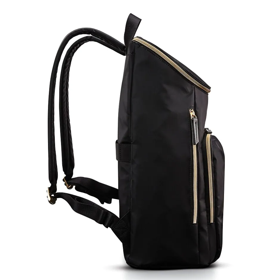 This Samsonite laptop backpack is made of water-resistant nylon material and features a padded laptop compartment and a tablet pocket. It also has a front organizer pocket, a side water bottle pocket, and a smart strap.