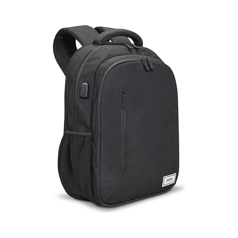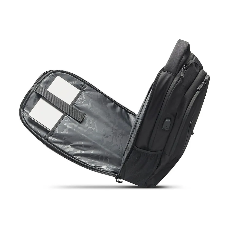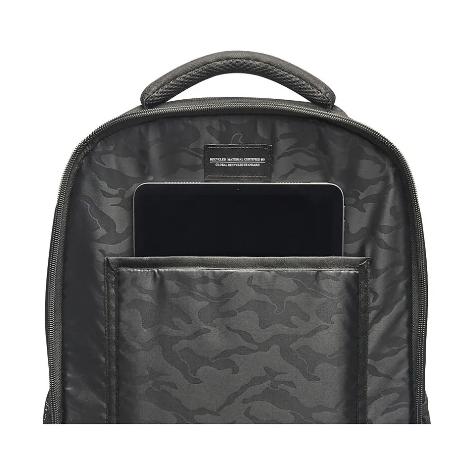 - With a black exterior made from recycled PET bottles, this laptop backpack makes travel with electronics simple