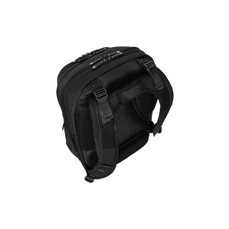 A perfect blend of style and storage, the Targus Spruce EcoSmart checkpoint-friendly backpack is designed to protect laptops up to 17″ with its SafePort Sling drop protection. Eco-friendly to its core, the backpack is constructed from 23 recycled plastic bottles and features nickel-free hardware and recyclable plastic components. To store your essentials, the backpack features an organized workstation with key clip, business card holder, pen loops, and zippered accessory pocket. A quick-access front pocket provides a convenient place to store items while on the go. The padded back panel and adjustable shoulder strap allow for a customized, comfortable fit. And for optimal travel, the patented checkpoint-friendly design helps you fly through airport screenings without removing your laptop. A colorful green interior lightens the case, making items stored inside more visible. Both sleek and sporty, the Spruce EcoSmart line offers a durable option with carefully selected materials to minimize your carbon footprint.