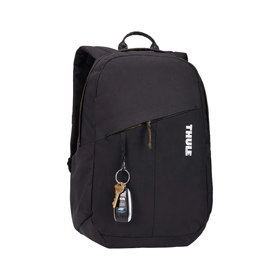The Thule Notus backpack features an environmentally friendly design constructed with recycled materials and has you covered for a full day on campus. Protect a PC up to a 14″ or a MacBook up to 16″ in the elevated padded pocket. Keep small accessories and pens secure and easy to locate in the zippered interior pocket. Stash snacks or a key card in the quick access slip pocket. Easily store water bottles, power cords, or accessories in the two side pockets. Made of bluesign approved 100% recycled 600D polyester fabric and bluesign approved 400D nylon fabric.