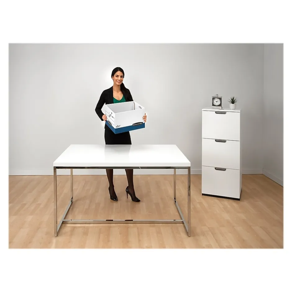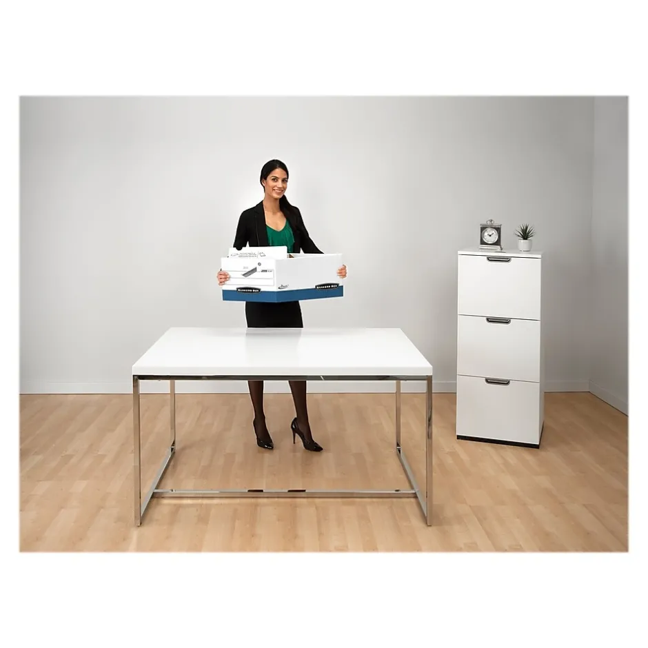 Maximize storage use with these stackable heavy-duty storage boxes. The reinforced handles are tear-resistant, letting you move these boxes around easily, while the included lid makes protecting documents from dirt, moisture and other damage simple. These Bankers Box Presto letter/legal-size storage boxes have a stacking capacity of 850 pounds and can be assembled quickly. Just push the corners together, and they are ready for use.