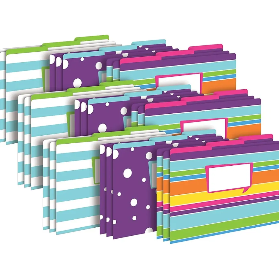 Barker Creek Happy legal-sized fashion file folders are raising the style bar for those of us who use legal folders at work, school, and home. Each package includes 27 beautifully designed legal-sized file folders – 9 folders each of 3 on-trend designs. Printed on durable 12 pt stock, the folders are 1/3 cut and include a preprinted “label” on the front for adding a table of contents, highlighting meeting agendas, listing contact information for team members….and so much more. Fully reversible, each folder has a colorful design on one side and a vibrant, solid color on the reverse side – perfect for color-coding your files, making file folder games and lap books. Coordinating products are available. Find them by searching: Barker Creek Happy.