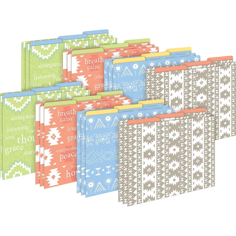 Barker Creek’s Thoughtfulness letter-sized file folders are an affordable way to organize your office, classroom, or home with style and flair. The set includes 24 folders — six each of four beautiful designs. The calm color palette and on-trend designs were inspired by the thoughtfulness, mindfulness, and meditation trends. Coordinating designs are printed on the inside making each folder fully reversible for added value! The tabs are 1/3 cut and the folders are printed on durable 14-point stock. They are great for everyday filing needs, presenting meeting handouts, organizing important papers, sending work home with students, storing treasured photos and archiving other significant mementos. The possibilities are limited only by your imagination! See Barker Creek’s full line of fashion-forward file folders!! Coordinating products available: Search Barker Creek Thoughtfulness.