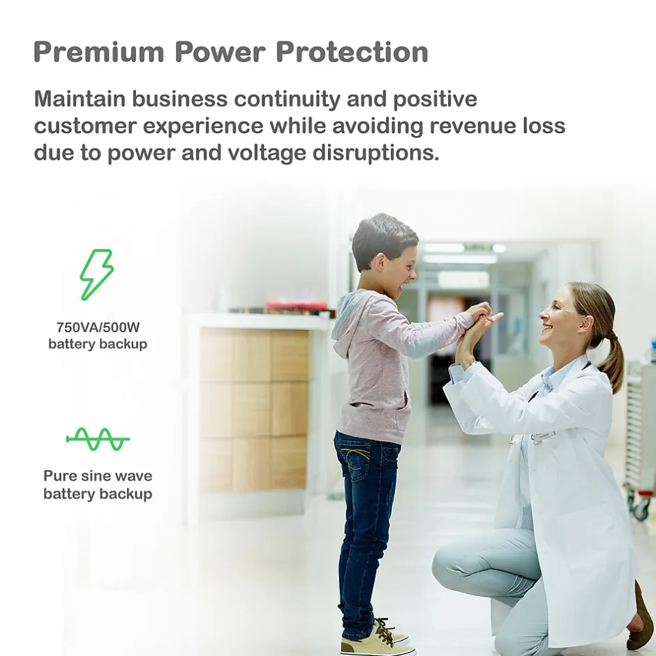 - Power Capacity of 750VA / 500W with 6 battery and surge protected outlets.